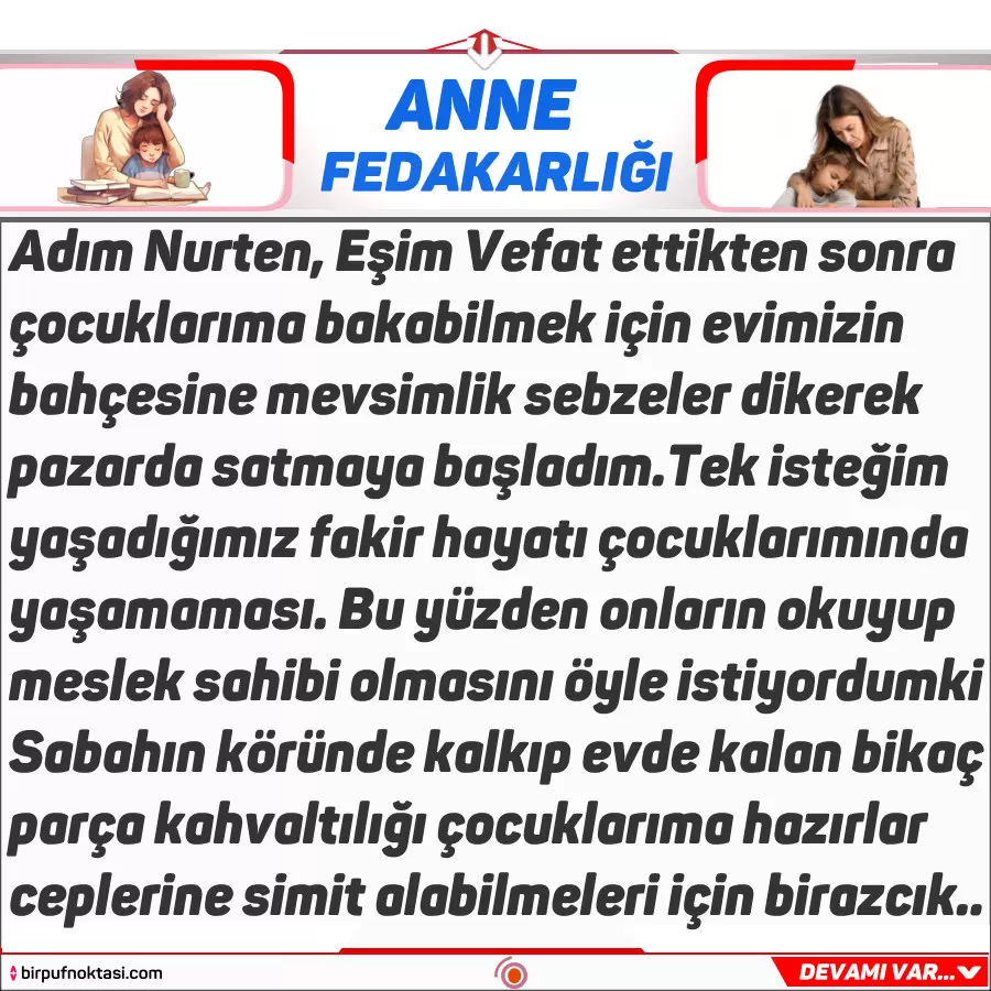 Adım Nurten; Eşim Vefat ettikten sonra çocuklarıma bakabilmek için evimizin önündeki bahçeye mevsimlik sebzeler dikip pazarda satmaya başlamıştım. Tek isteğim yaşadığımız yoksul hayatı çocuklarımın da yaşamamasıydı. Bu yüzden onların okuyup meslek sahibi olmasını o kadar istiyordum ki. Sabahın köründe kalkıp evde kalan birkaç parça kahvaltılığı çocuklarıma hazırlar, önlüklerinin ceplerine de 4-5 lira , öğle yemeğinde simit alabilmeleri için koyardım. her sabah evden çıkar pazara giderdim. Bir sabah kalktığımda, yine fırından yarı parasına aldığım 1 bayat ekmeği kestim, küçük bir parça peynir ve 10 kadar zeytini ekmeğin yanına katık olarak koydum, O sırada 10 yaşındaki oğlum Veysel uyanmıştı. Bir an bana baktı. Üzerimde sayısız yaması olan eteğim ve oldukça eski olan hırkamı inceledi uzun uzun. tam yine önlüklerine 5 lira koyup kapıdan çıkacakken, -“O paraları bize verme annecim. Kendin için biriktir. Bak eteğin ve hırkan çok eskimiş. Hem sen neden hiç kendine bir şey almıyorsun da, olan paranı da bize veriyorsun? -” dediğinde, gözyaşlarım yanaklarımdan süzülmeye başlamıştı göstermek istemedim oğluma. Ve biraz kızmış gibi yaparak, -“Hadi hadi çok konuşma. Anneler çocuklarını çok severler. O yüzden her şeyin en güzelini çocukları giysin isterler. Şimdi kardeşini de uyandırıp kahvaltınızı yapın. Sonra doğru okula-“ dedim . Pazar yerine gidene kadarda oğlumun yolda söyledikleri aklıma geldikçe gözyaşlarımı tutamıyor durup durup ağlıyordum.