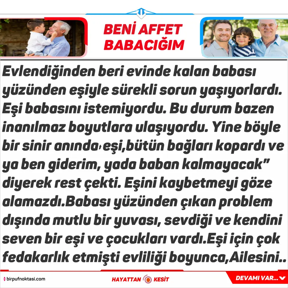 Evlendiğinden beri evinde kalan babası yüzünden eşiyle sürekli problem yaşıyorlardı. Eşi babasını istemiyor ve onun evde bir fazlalık olduğunu düşünüyordu. Bu durum bazen inanılmaz boyutlara ulaşıyordu. Yine böyle bir sinir anında; eşi, bütün bağları kopardı ve “Ya ben giderim, ya da baban bu evde kalmayacak” diyerek rest çekti… Eşini kaybetmeyi göze alamazdı. Babası yüzünden çıkan problemler dışında mutlu bir yuvası, sevdiği ve kendini seven bir eşi ve birde çocukları vardı. Eşi için çok fedakarlık etmişti evliliği sırasında. Ailesini ikna etmek için çok uğraşmış ve çok sorunlarla karşılaşmıştı. Hâlâ onu çok seviyordu.