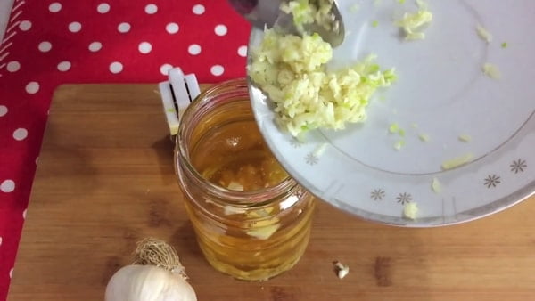 Organik sirkeyi tamamen ezilmiş sarımsaklarla karıştırın ve cam kavanoza aktarın. Sirkeli sarımsağın ağzını sıkıca kapatın ve koyu renkli bez torba içinde, karanlık bir bölgede 15 gün süresince bekletin.