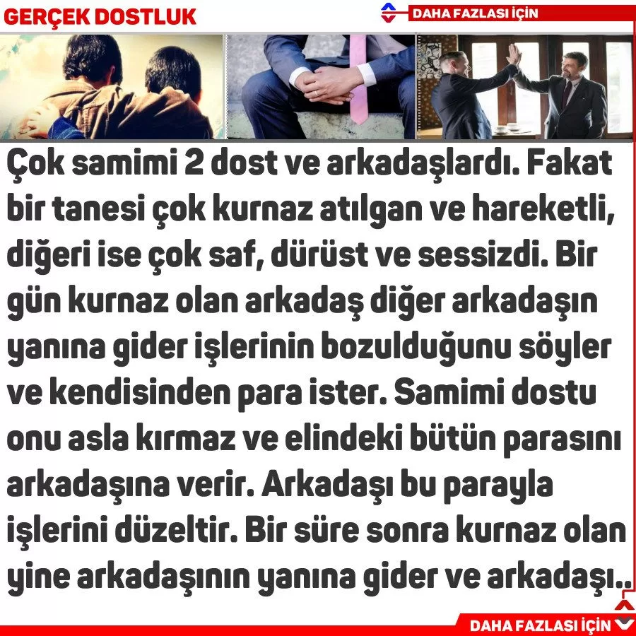 sevdiğim bir dostum vardı. Bir gün işleri bozulunca benden borç para istedi elimdeki bütün parayı verdim. Evlenmek üzere olduğum nişanlıma aşık olduğunu çok sevdiğini söyleyerek benden aralarından çekilmeme istedi. Çok üzülerek te olsa aralarından çekildim. Çünkü biz gerçek dosttuk onun üzülmesini istemedim. işlerim bozulduğunda onun fabrikasına gittim ve çalışmak için kendisinden iş istedim. Bana iş vermedi. çok üzüldüm, ama yine de arkadaşıma kızmıyorum. çünkü biz gerçek dosttuk. Bu konuşma üzerine kurnaz olan arkadaşı daha fazla dayanamaz mikrofonu eline alır ve başlar konuşmaya; Benim de bir zamanlar çok sevdiğim bir dostum vardı. İşlerim bozulduğunda kendisinden para istedim, bütün parasını bana verdi. Sonra ondan nişanlısını istedim, üzülerek te olsa nişanlısını da verdi. Nişanlısını istememin nedeni o kadının arkadaşıma layık olmamasıydı (Hayat kadınıydı) Kendisi çok saf olduğu için arkadaşımı o kadından bu şekilde kurtardım. İşleri bozulduğunda gelip benden iş istedi, Arkadaşımı kendi emrimde çalıştıramazdım, o yüzden iş vermedim. Günün birinde karşılaştığı yaşlı adam benim babamdı. Babam vefat etmek üzereydi, onu arkadaşımın yanına ben gönderdim ve mirasını ona ben bıraktırdım.
