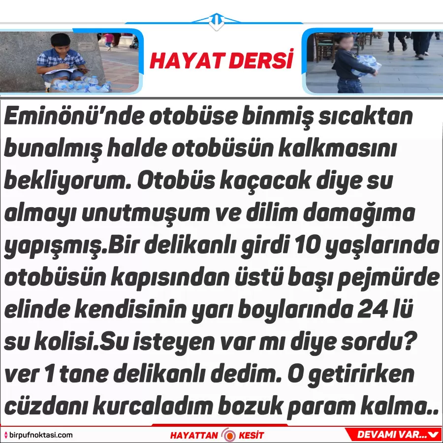 Eminönü’nde otobüse binmiş sıcaktan bunalmış halde otobüsün kalkmasını bekliyorum. Otobüs kaçacak diye su almayı unutmuşum ve dilim damağıma yapışmış. Bir delikanlı girdi 10-12 yaşlarda otobüsün kapısından üstü başı pejmürde pasaklı elinde kendisinin yarı boylarında 24 lü su kolisi.. Su isteyen var mı diye sordu? Ver 1 tane delikanlı dedim. O getirirken cüzdanı kurcaladım bozuk param kalmamış. 10 lira verdim alnından akan hakikaten toplumun yüzde doksanının unuttuğu alın terini sildi ufak Adam. Ve elini cebine attı onunda 2 lira bozuk parası varmış.