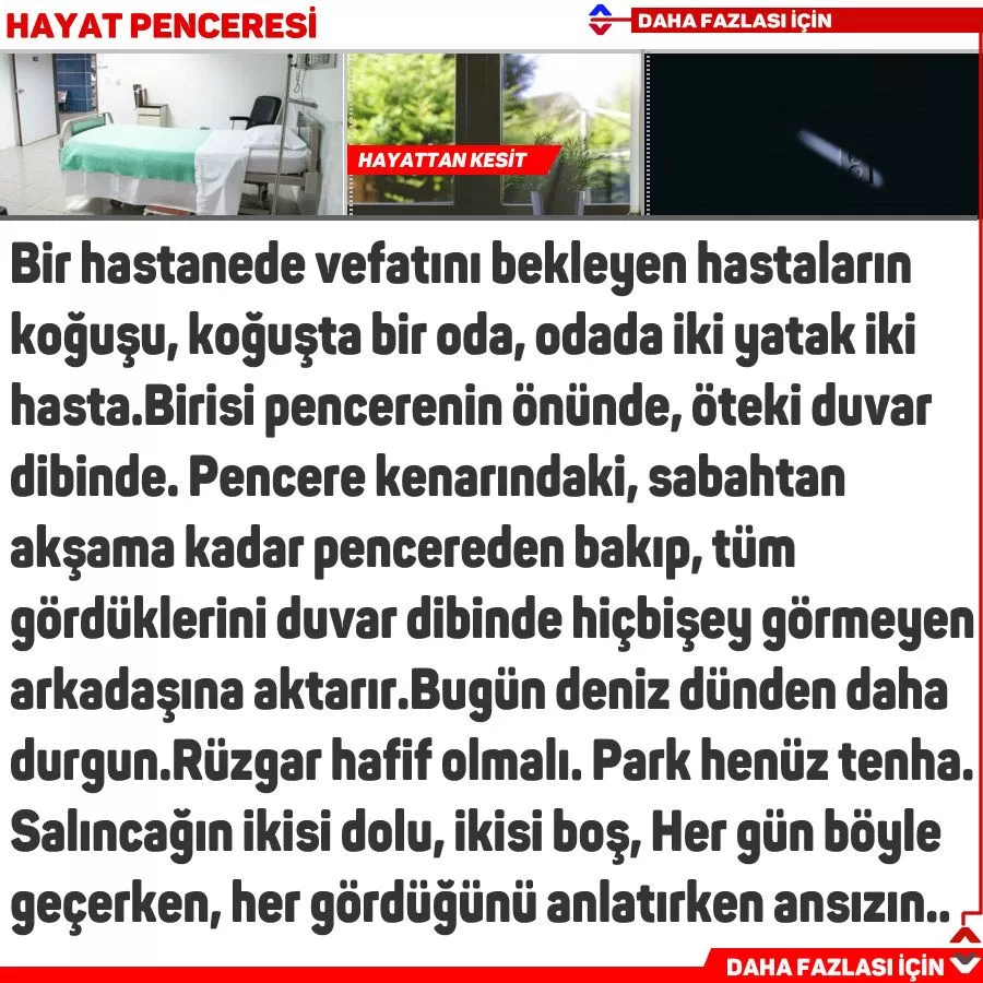 Ama… ama… arkadaşı vefat ederse, pencerenin yanı boşalacaktır. Ve duvar dibindeki düğmeye basmaz, doktor çağırmaz. Arkadaşı vefat eder. Ertesi sabah duvar dibindekinin yatağını pencerenin yanına taşırlar. Beklediği an gelmiştir. Yattığı yerden pencereden dışarı bakar. Pencerenin dibinde kapkara duvardan başka hiçbir şey yoktur.