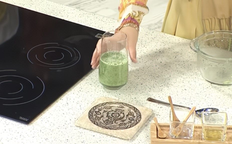 - İsteğe bağlı 1 tatlı kaşığı doğal bal ile tatlandırın. Son olarak naneli karışımın posasını ayırın, portakal suyunu ve limon suyunu ekleyerek karıştırın.