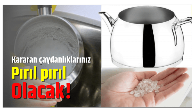 Bunun yanında kararan çaydanlığın dışını temizlemek için, bir bardak sirkenin içine 1 çay kaşığı tuz atın ve tamamen eritin. Sonra çaydanlığın dışını bu sirke-tuz karışımıyla silin. Böylelikle kararan çaydanlığınız pırıl pırıl olacaktır.Metal çaydanlıklarınızda amonyaklı temizleyiciler yerine doğal yöntemleri kullanmanız, çaydanlıkların aşınmamaları açısından önemlidir. Ayrıca doğal yöntemleri tercih etmek sağlık açısından da faydalı olacaktır.Evde uygulayacağınız doğal malzemelerle yine çaydanlığınızın içini de parlatabilirsiniz.
