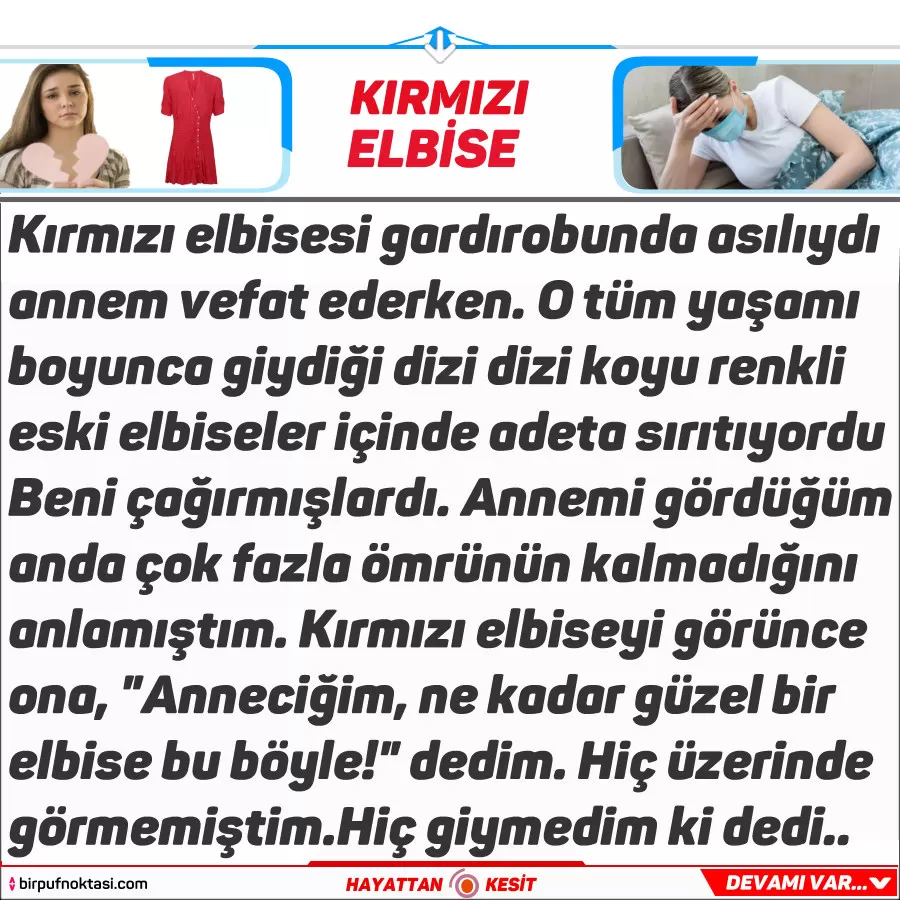 Kırmızı elbisesi gardırobunda asılıydı annem vefat ederken. O tüm yaşamı boyunca giydiği dizi dizi koyu renkli eski elbiselerin yanında adeta sırıtıyordu. Beni çağırmışlardı. Ve annemi gördüğüm anda çok fazla ömrünün kalmadığını anlamıştım. Kırmızı elbiseyi görünce ona, “Anneciğim, ne kadar güzel bir elbise bu böyle!” dedim. Hiç üzerinde görmemiştim Hiç giymedim ki dedi usulca.