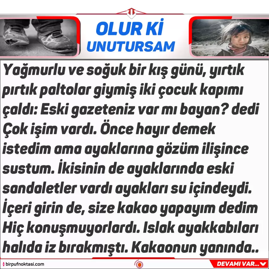 -“Eski gazeteniz var mı bayan?” Çok işim vardı. Önce hayır demek istedim ama ayaklarına gözüm ilişince sustum. İkisinin de ayaklarında eski sandaletler vardı ve ayakları su içindeydi. “İçeri girin de, size kakao yapayım” dedim.
