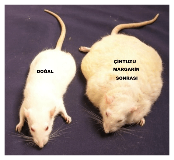 - Tereyağı masraflı gelince ve üreticiler bizim tüketim çılgınlığımıza yetişemeyince kendi işlerine geldiği gibi plastik molekullerine hidrojen ile katkı maddeleri enjekte ederek margarini buldular..