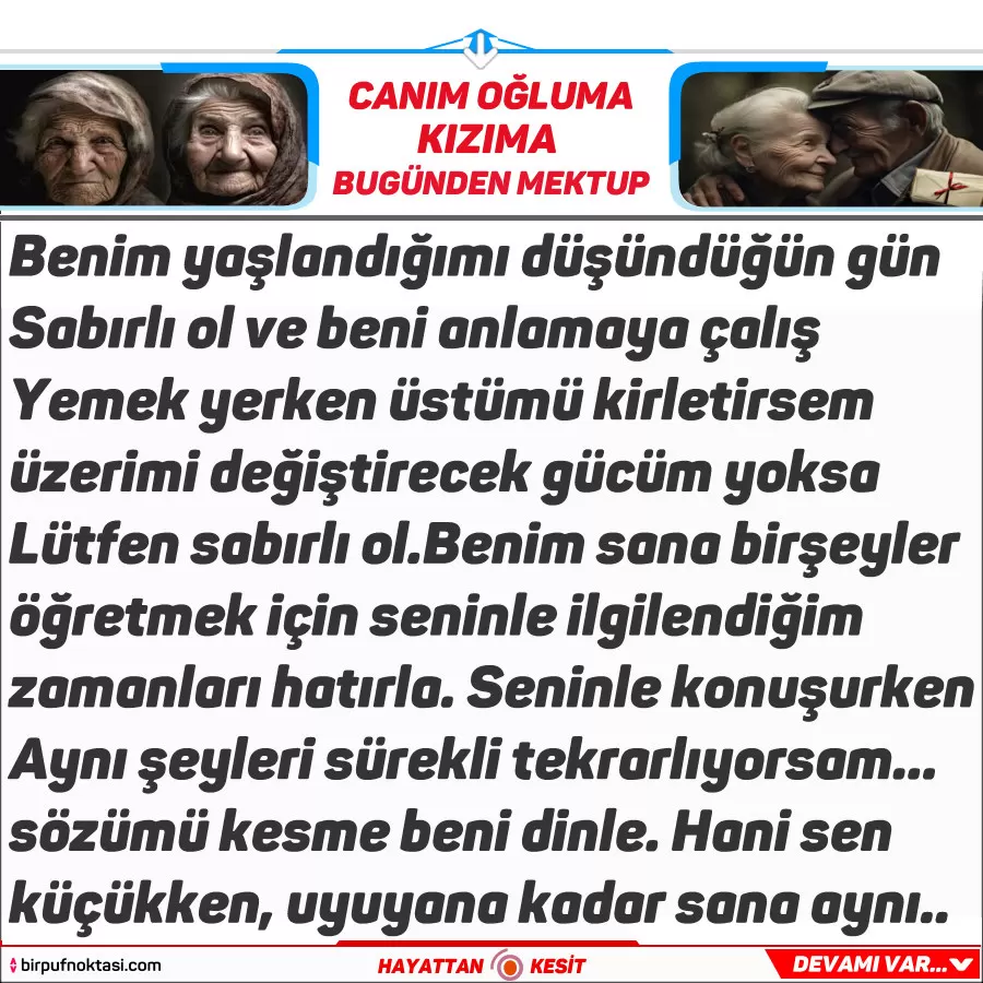 Yavrucuğum… Benim yaşlandığımı düşündüğün gün; Sabırlı ol lütfen ve beni anlamaya çalış… Yemek yerken üstümü kirletirsem üzerimi değiştirecek gücüm yoksa. Lütfen sabırlı ol. Benim sana bir şeyler öğretmek için seninle ilgilendiğim zamanları hatırla…