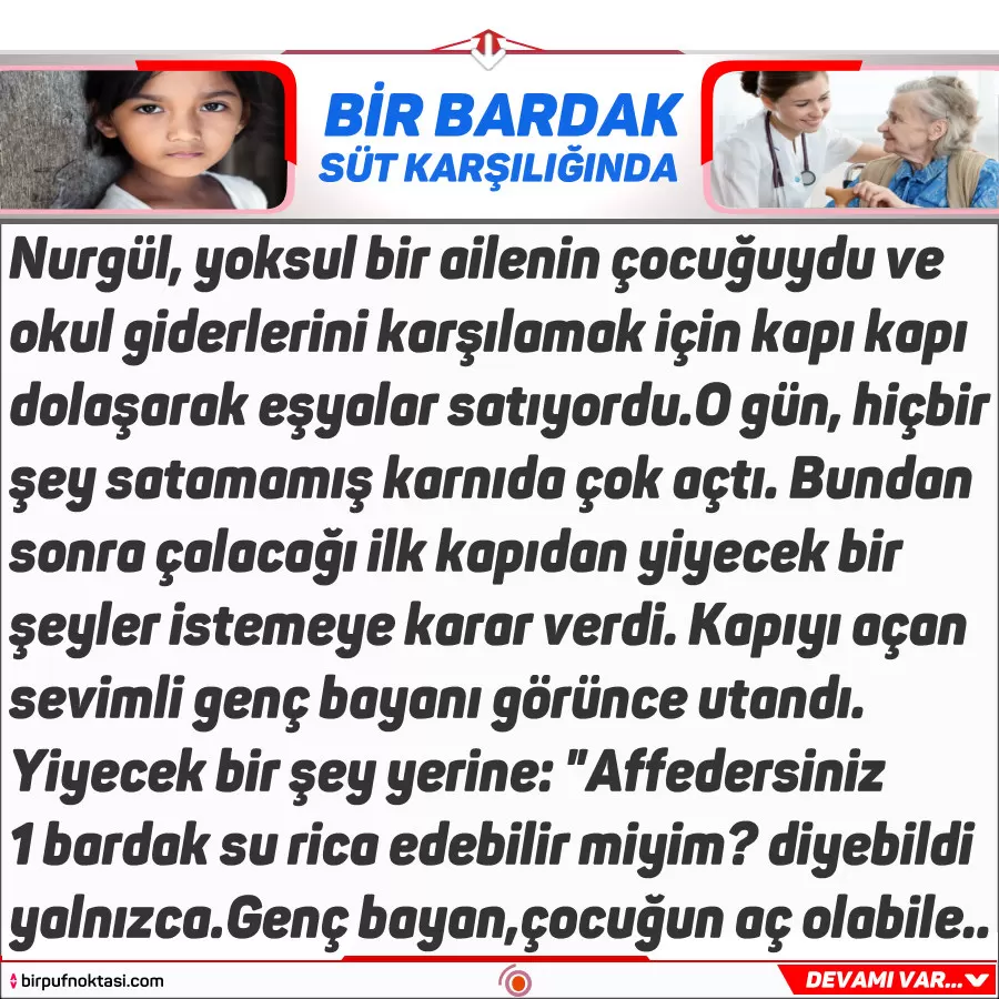 Nurgül, yoksul bir ailenin çocuğuydu ve okul giderlerini karşılamak için kapı kapı dolaşarak eşyalar satıyordu. O gün, hiçbir şey satamamıştı ve karnı da çok açtı. Bundan sonra çalacağı ilk kapıdan yiyecek bir şeyler istemeye karar verdi. Kapıyı açan sevimli genç bayanı görünce utandı. Yiyecek bir şeyler yerine: