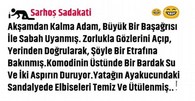 Aspirinleri içerken, komodindeki not dikkatini çekmiş; “Sevgilim, günaydın. Kahvaltın mutfakta. Ben alışverişe çıkıyorum, erken dönerim. Seni seviyorum”. Kalkıp, giyinmiş ve kahvaltı için mutfağa gitmiş. Bakmış oğlu oturmuş, kahvaltı ediyor. Masada da kendi servisi ve gazeteleri duruyor. Oturmuş, kahvaltısına başlamış ve oğluna sormuş; ‘Evlat, dün gece ne oldu, biliyor musun?’