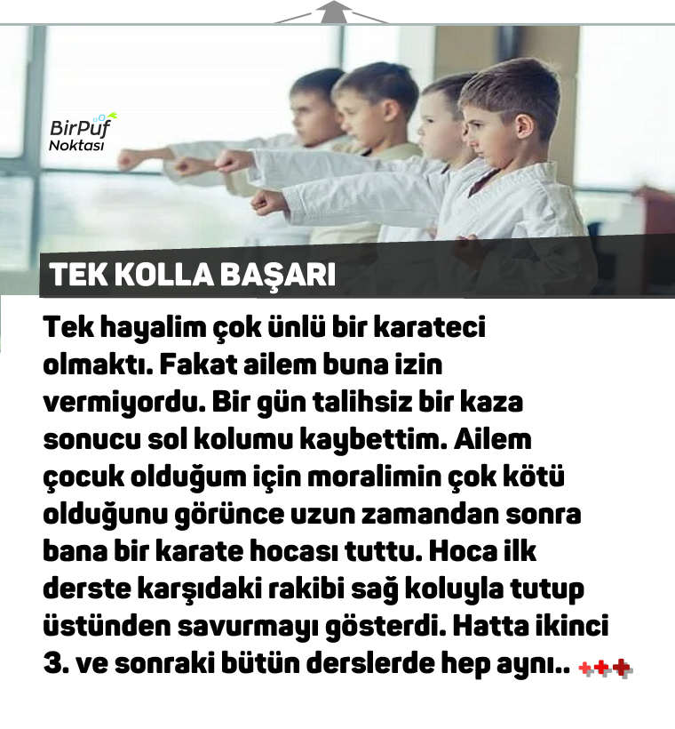 Tek hayalim çok ünlü bir karateci olmaktı. Fakat ailem buna izin vermiyordu. Bir gün talihsiz bir kaza sonucu sol kolumu kaybettim. Ailem çocuk olduğum için moralimin çok kötü olduğunu görünce uzun zamandan sonra bana bir karate hocası tuttu. Hoca ilk derste karşıdaki rakibi sağ koluyla tutup üstünden savurmayı gösterdi. Hatta ikinci, üçüncü ve sonraki bütün derslerde hep aynı hareketi yapıyorlardı.