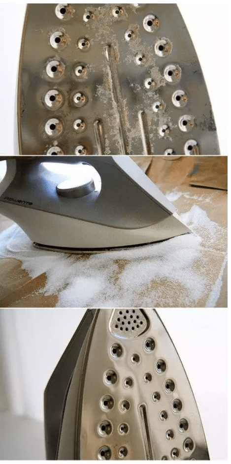 Ütü masanızın üzerine yumuşak bir örtü koyun. Örtünün üzerine de tuz serpin. Şimdi ütünüzü en yüksek sıcaklığa getirin ve buhar ayarı açıksa kapatın. Üzeri tuz kaplı örtünün üzerine ütünüzü birkaç kez gezdirin. Ancak çok baskı yapmayın. Birkaç dakika sonra ütünüzün tabanı yepyeni görünecek.