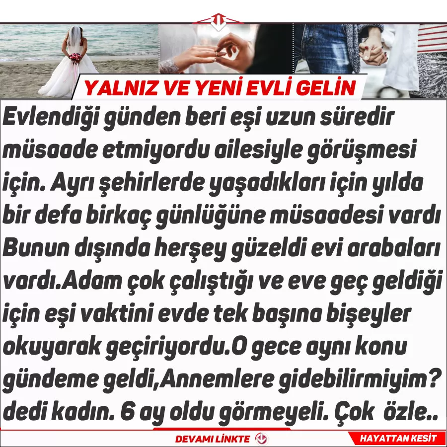Evlendiği günden beri eşine uzun süredir müsaade etmiyordu ailesiyle görüşmesi için. Ayrı şehirlerde yaşadıkları için yılda bir defa birkaç günlüğüne müsaadesi vardı sadece. Bu sorun dışında her şey çok güzeldi, güzel bir evleri ve arabaları vardı. Adam çok çalıştığı ve eve geç geldiği için ev hanımı olan eşi vaktini evde yalnız başına düşünerek veya bir şeyler okuyarak geçiriyordu. O gece yine aynı konu gündeme gelmişti;
